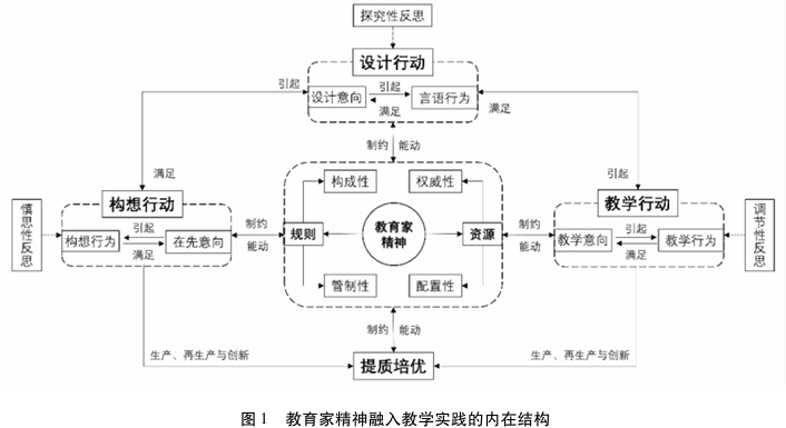 强国必先强教,强教必先强师。面向2035年,我国旨在培养和造就数以万计的教育家型教师,以支持教育强国和民族复兴的发展战略。随着该发展战略的推进,更多教师立志成为教育家型教师。在国家战略与个人志趣的推动下,广大教师高度关注教育家型教师特性和成长路径。2023年9月,习近平总书记完整地阐述了新时代中国特有的教育家精神的核心要义,为教师成长为教育家型教师提供了构成元素、方向指引、实践遵循和评判标准。显然,教育家型教师的成长需要具备并践行教育家精神,且在教学实践中展现创新、贡献和影响力。因此,探明教育家精神融入教学实践的内涵意蕴、运行逻辑和优化路径,对广大教师适应创新驱动、履行提质使命、培养创新人才、实现生命价值以及成为新时代教育家型教师,具有重大现实意义。根据安东尼·吉登斯的结构二重性理论,教育家精神是一种具有内在逻辑统一性和系统性的精神结构,而教学实践则是教师为促进学生综合素养日臻完善而进行的一系列培养行动的总和。厘清二者的关系,对于领会教育家精神融入教学实践的内涵意蕴至关重要。吉登斯指出,结构制约行动,也能使行动;行动者在利用结构中规则和资源进行实践的过程中,也在不断地再生产和创新结构。据此,可以从核心本质、前提基础以及终极归属三个方面,探讨教育家精神融入教学实践的内涵与价值。教育家精神融入教学实践本质上是教育家精神引领的意向性行动。意向性行动的特征在于行动者怀着“特定的理由”而采取“适用的行动”。在精神融入中,教师将教育家精神作为一切行动的理由和依据,它规定了教学实践的本质属性和执行方式。吉登斯将这种意向性行动阐述为理思交融,即理性化行动与反思性实践的交互统一。因此,教育家精神融入教学实践需要教师将理性化行动和反思性实践完美地融合起来,展开教育家精神引领下理性化的构想、设计和教学行动,以及对这些行动相应的慎思性、探究性和调节性反思(见图1)。理性化行动是以教育家精神的理论性理解为基本理由和根本遵循而展开的一系列间隔有序、递相引伸的意向性教学实践行动。吉登斯指出,理论性理解具有内化的例行化特征,它能激活行动者对自身行动的根据始终保持理性,并对特定教育现象或问题进行基于逻辑、证据和理性的系统性认知。与吉登斯不同,约翰·R. 塞尔更注重探究意向性行动的内在构成和运行规律。塞尔指出,意向性行动是由意向性(在先意向、行动中意向)和行为三种要素构成的间隔有序结构;意向性通过心理因果关系,使它所指向的事件得以递相引伸,而行为特指身体动作及其组合;精神、意向和行为之间存在着因果引起和条件满足关系,即精神引出意向并触发行为,行为达成意向并体现精神。此外,衣新发依据教学实践行动的时空逻辑,将其细化为构想、设计和教学行动三个阶段(见图1)。构想行动即“想课”,全盘考虑和规划教学;设计行动即“备课”,用语言来设计方案;教学行动即“上课”,实施设计,引起成效。总之,理性化行动强调行动理由的合理性与适用性、行动结构的复杂性和逻辑性以及“精神—意向—行动”的递相引伸关系。