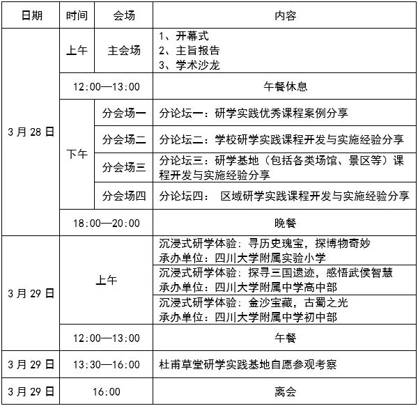 为深入学习贯彻党的二十届三中全会和《教育强国建设规划纲要(2024-2035年)》精神,落实《义务教育课程方案(2022年版)》、《中小学综合实践活动课程指导纲要》以及《关于推进中小学生研学旅行的意见》等相关政策要求,中国教育学会中小学综合实践分会定于2025年3月27日至29日在四川省成都市举办2025年研学实践高质量发展研讨会。本次会议旨在落实立德树人根本任务,深化基础教育课程改革,进一步推动育人方式变革,充分发挥研学实践教育的综合育人价值,校家社协同促进中小学研学实践高质量发展。现将有关事项通知如下: